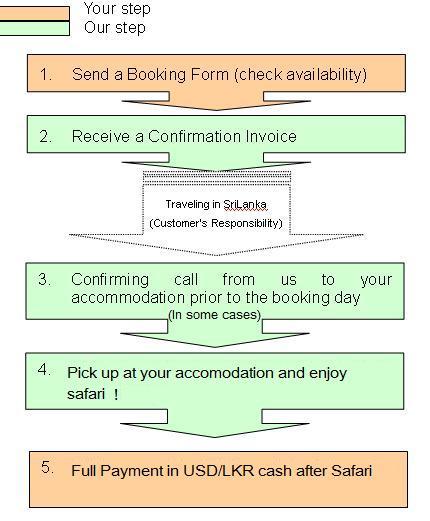 Once you have decided which service you require, please fill following booking form and send us to check availability. We will forward to you a Confirmation Invoice if your requirement is available. After your safari/camping/jeep hires, full payment on your Confirmation Invoice must be done directly to driver in USD or LKR cash.